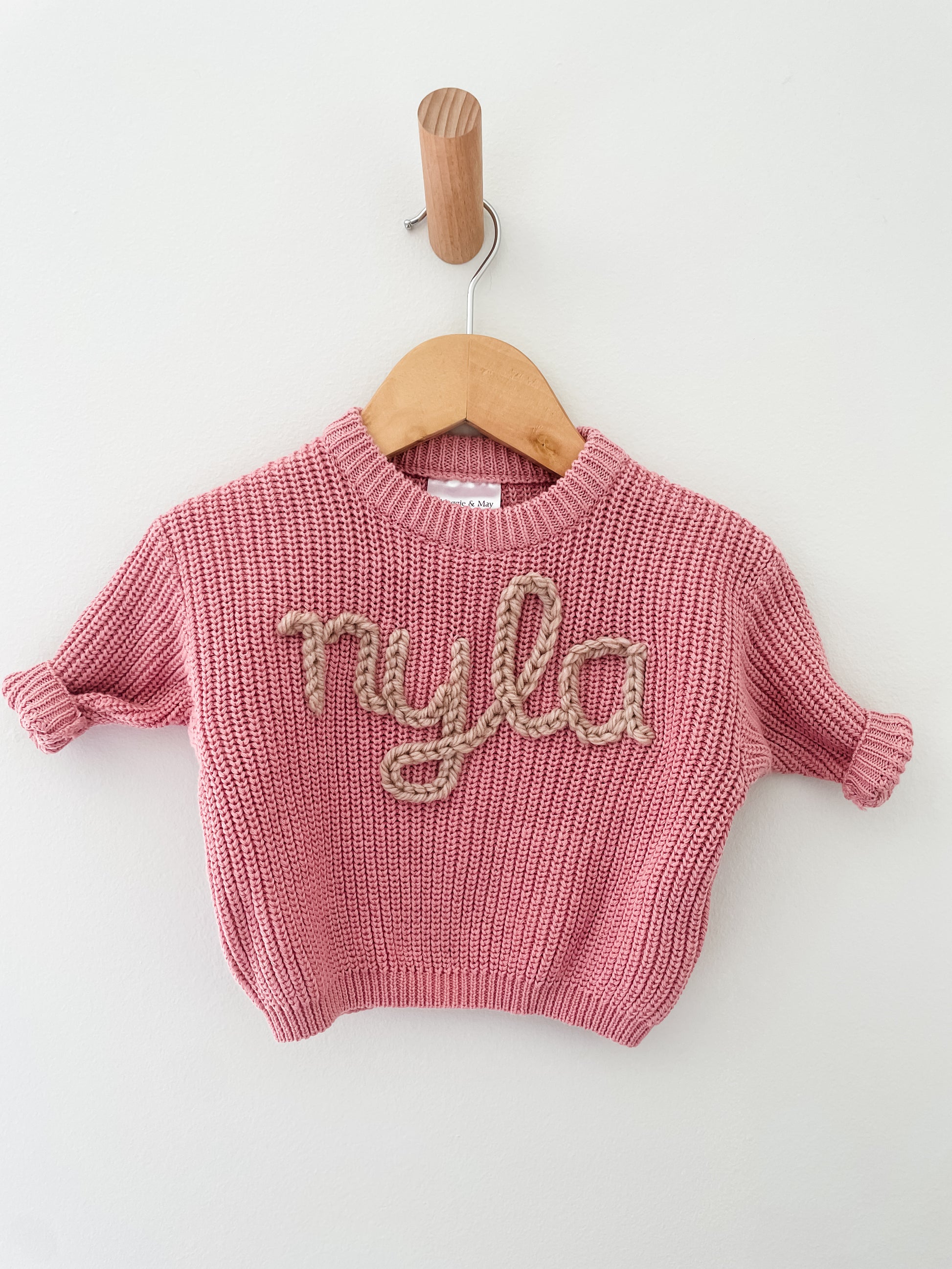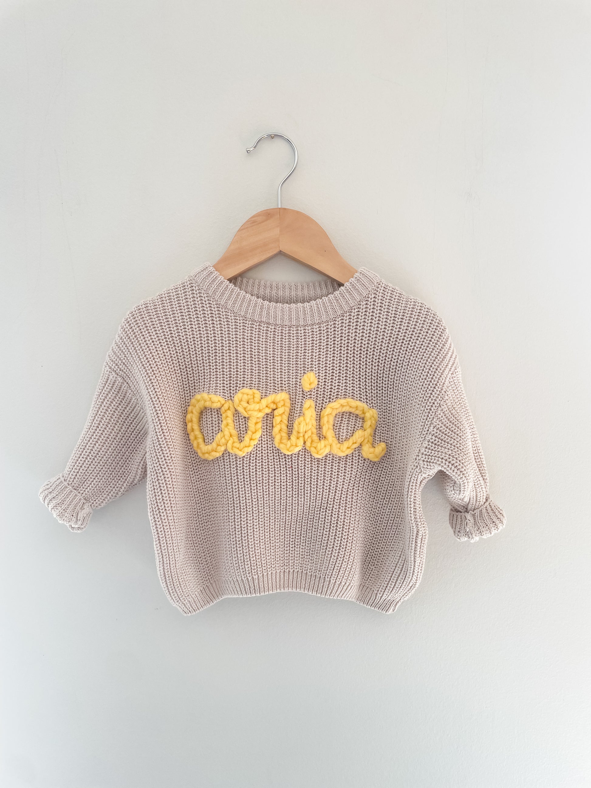 This product is for a simple name/word on a knit of your choosing. We can write a name, nickname, announcement (eg. big sis)...whatever you would like!